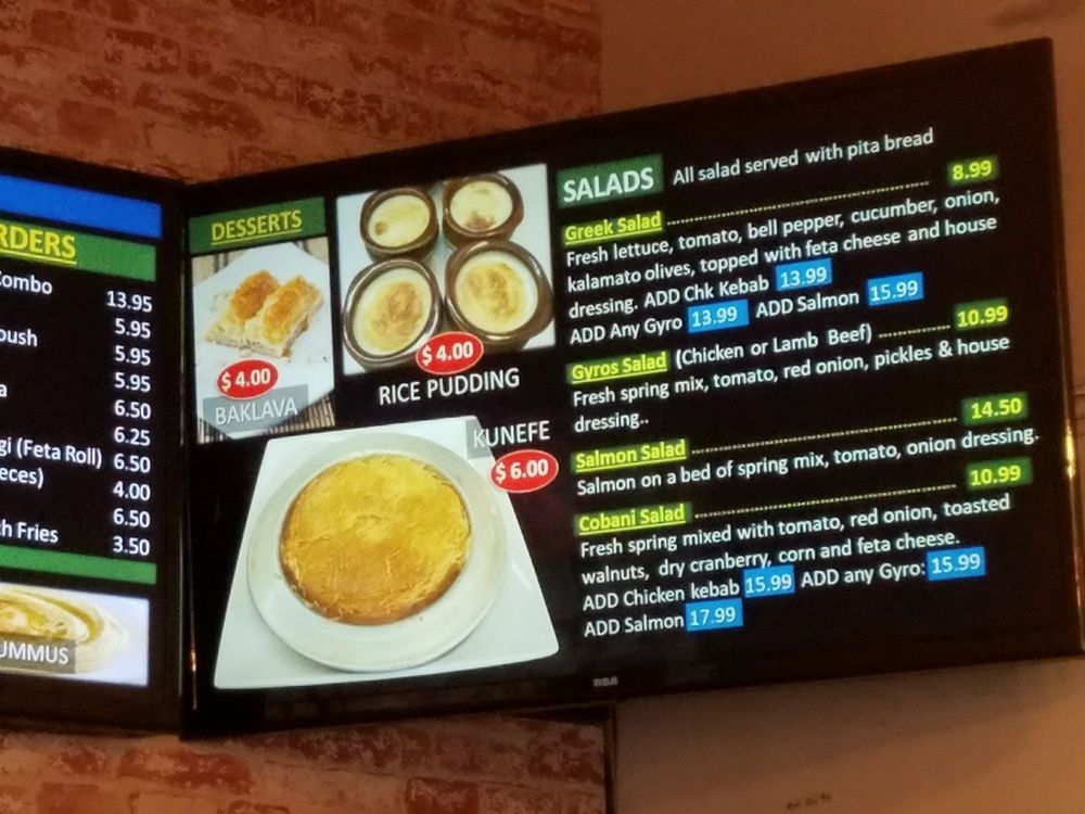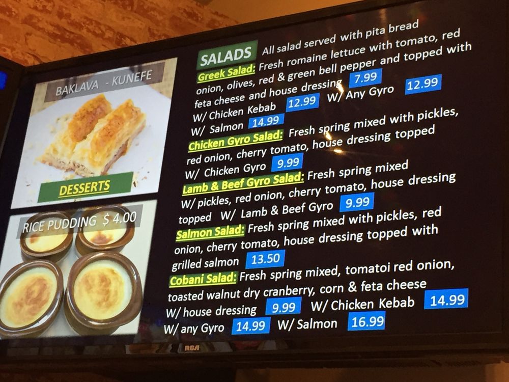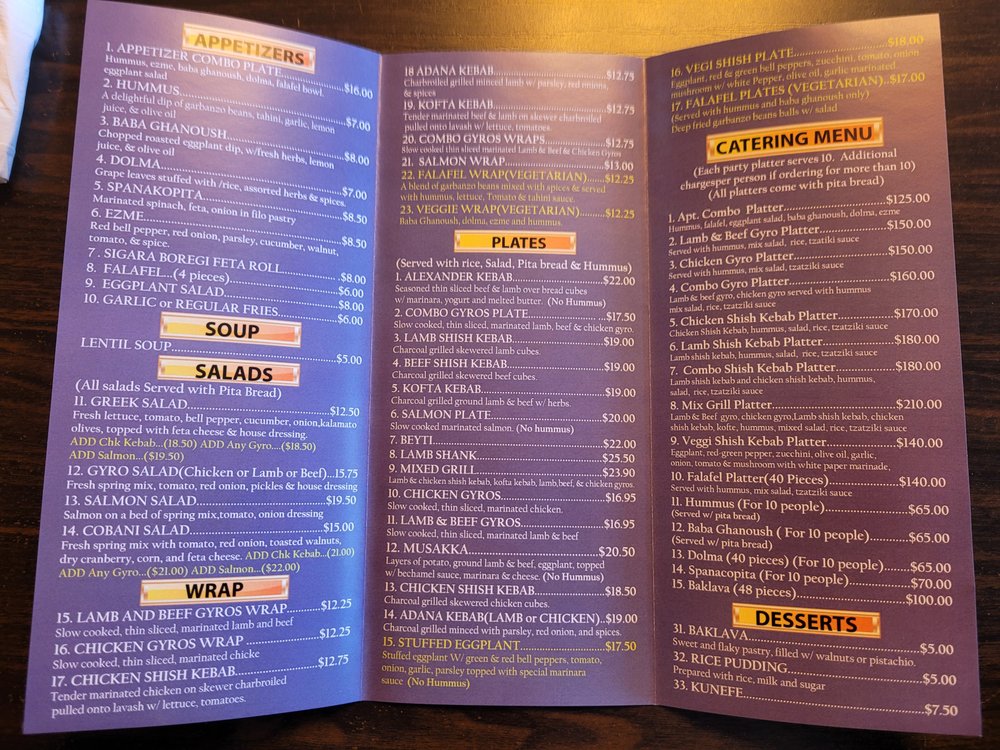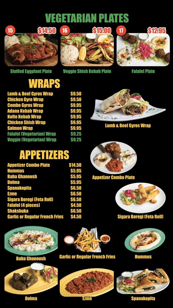 Lamb chicken shish kebab, kofta kebab, lamb, beef, and chicken gyros.