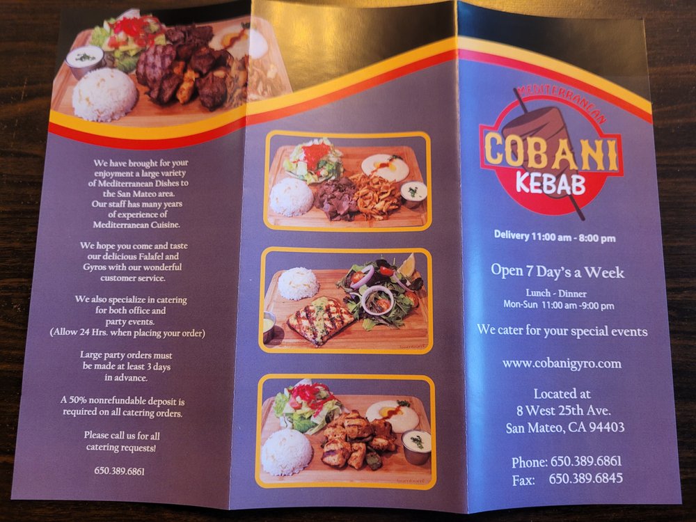 Introducing Cobani Gyro & Kebab, a Mediterranean gem in San Mateo, CA. This casual spot offers a wide range of dishes, from the flavorful Alexander Kebab Plate to the mouth-watering Lamb Beef Gyros Wrap. They pride themselves on accommodating vegan options, with dishes like the Adana Kebab Wrap. Customers rave about the generous portions and high-quality ingredients used in their meals. The ambiance is cozy and clean, perfect for a quick bite or a leisurely meal. The staff is friendly and efficient, ensuring a pleasant dining experience. Overall, Cobani Gyro & Kebab is a must-try for Mediterranean food enthusiasts looking for delicious, fresh, and satisfying plates.